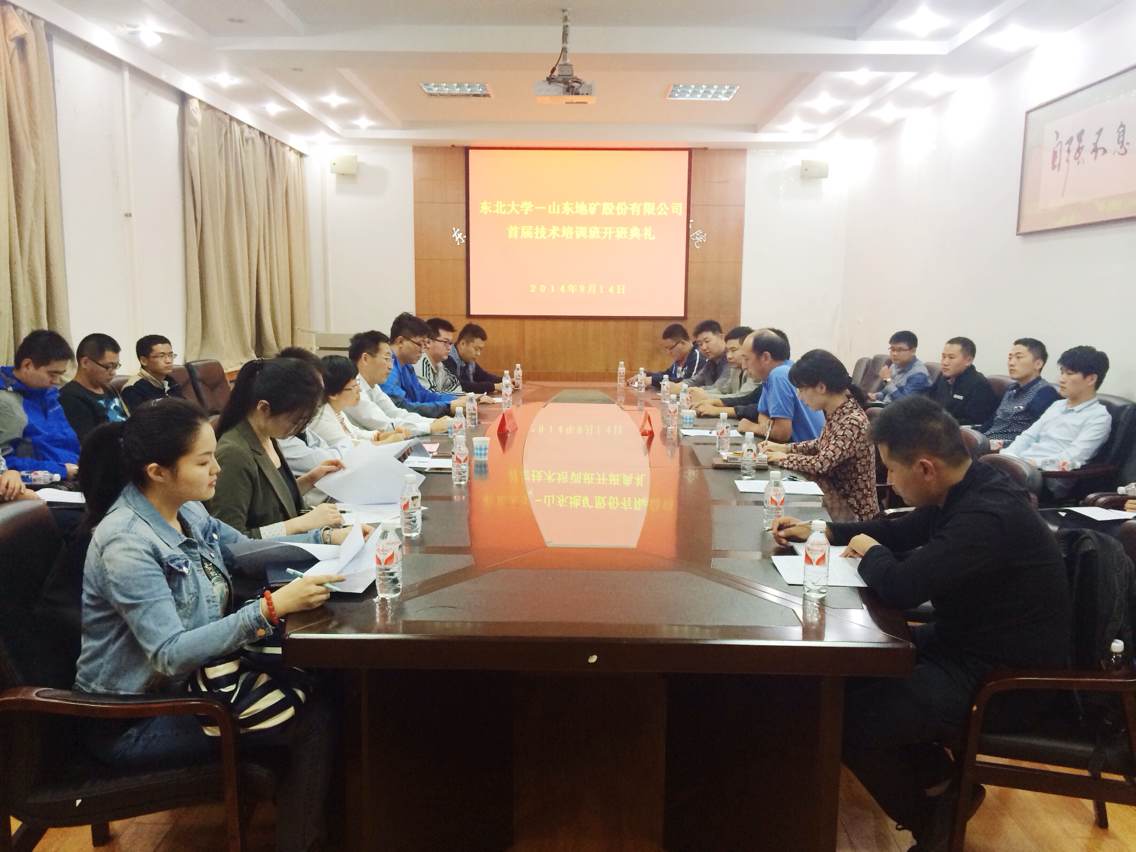 2014年9月14日,在东北大学采矿馆会议室,东北大学——山东地矿股份有限公司首届技术培训班开班典礼顺利召开。东北大学资源与土木工程学院副院长赵文、山东地矿股份有限公司监事会主席、党委副书记王传进、山东地矿股份有限公司人力资源部部长慕春英及30名培训学员参加开班典礼。
