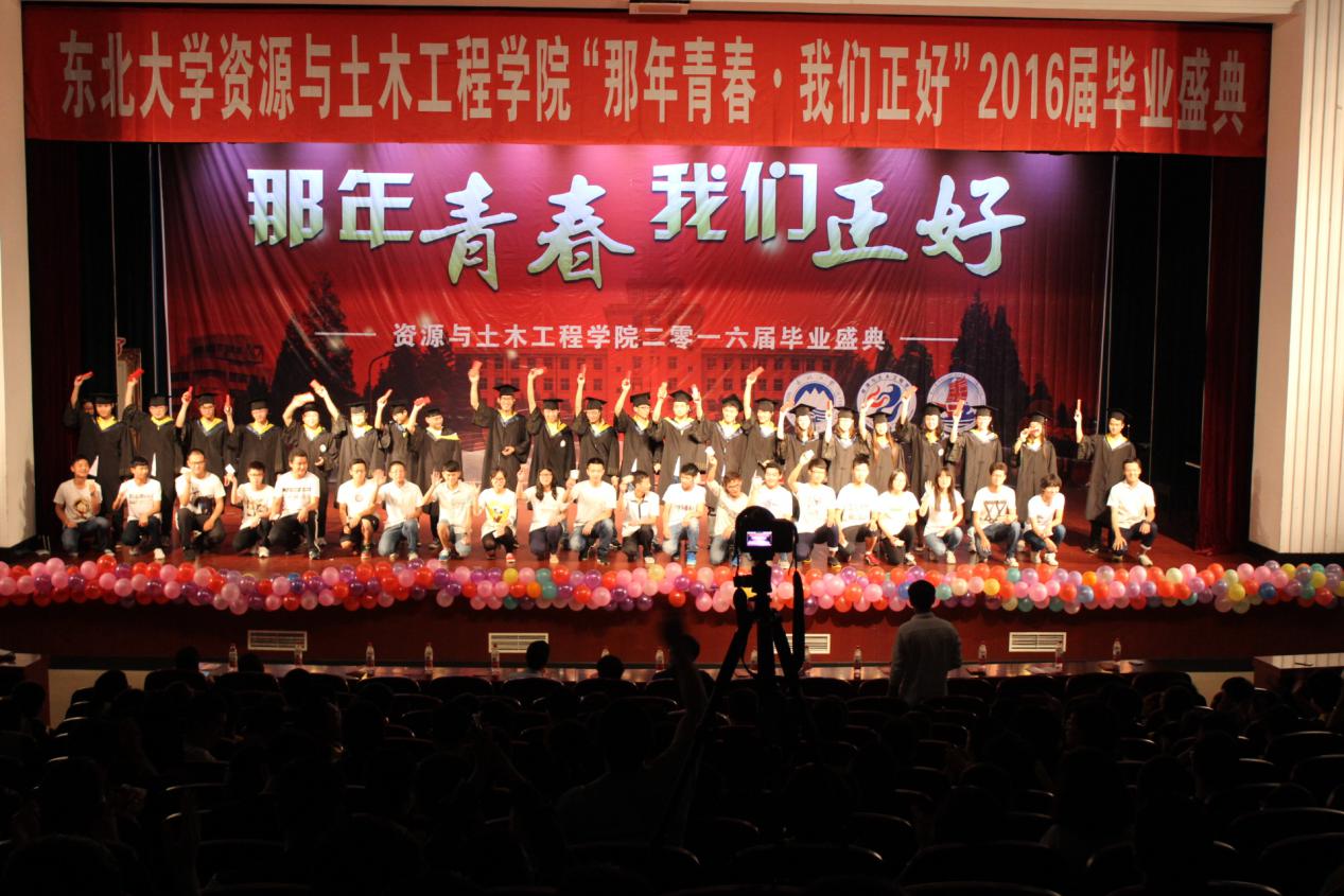 6月14日晚,资源与土木工程学院“那年青春·我们正好”2016届毕业盛典于汉卿会堂蔡冠深报告厅隆重拉开帷幕。资土学院党委书记王立慧、党委副书记兼副院长刘维、校团委组宣部部长李瑞奇、学生工作办公室主任吴迪、土木工程1202班导师李鑫以及学院各年级辅导员出席本次盛典,与资土学院12级全体本科毕业生欢聚一堂,共同度过难忘之夜。