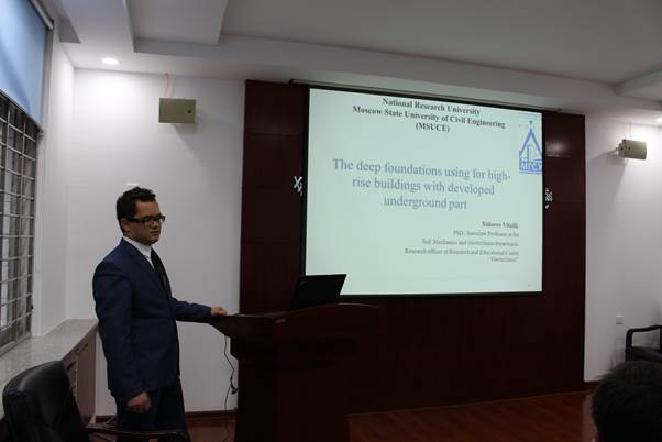 Vitalii Sidorov副教授做了题为“The deep foundations using for high-rise buildings with developed underground part ”的学术报告,阐述了现有深基础沉降计算方法的不完整性,并介绍了单桩及群桩深基础工程的沉降变形计算方法。