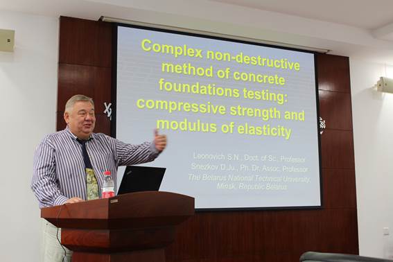 Sergei Leonovich教授做了题为“Complex non-destructive method of concrete foundations testing: compressive strength and modulus of elasticity ”的学术报告,介绍了一种复杂的混凝土基础的无损测试方法,对相关理论进行了深入讲解。Sergei Leonovich教授介绍了Minsk城市的深大基坑工程,并详细阐述了无损检测技术在基础强度测试上应用,以及超声测试方法在工程裂缝尺寸确定方面的应用。