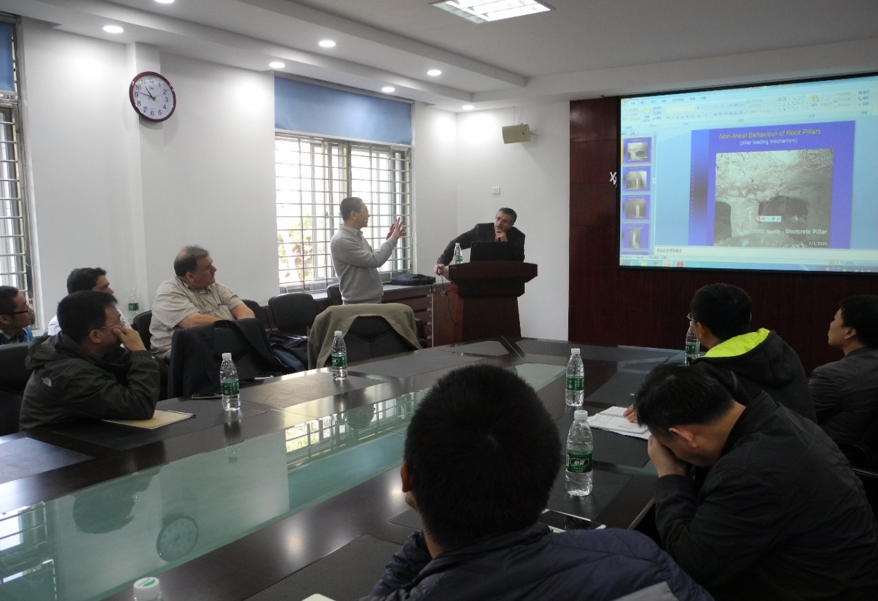 Ali Mortazavi 教授作了题为 “Application of Advanced Numerical Methods to the Design of Deep Underground Structures” 的学术报告,介绍了岩石力学数值技术在深部采矿工程中的应用和加拿大先进充填技术的工程实例;针对矿柱失稳破裂现象,介绍了矿柱失稳的数值模型、矿柱应力状态及破坏模式的分析方法、以及矿柱稳定性预测评价方法等。