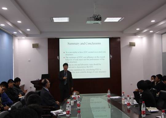 Sang-ki Kwon教授作了题为“Investigation of the influence of EDZ”的学术报告,Sang-ki Kwon的研究表明开挖岩体周围不可避免的存在开挖扰动区,开挖扰动区对岩体结构整体稳定性存在影响,实验室研究以及工程设计需要予以考虑。