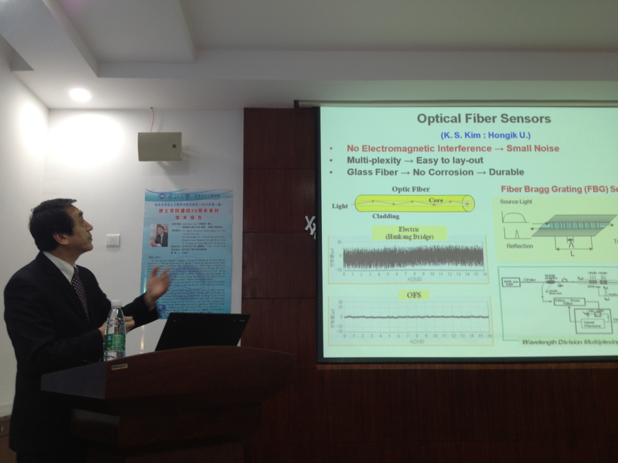 为庆祝资源与土木工程学院建院20周年,韩国工程院院士、韩国釜山国立大学教授Joon Hyun Lee(李俊铉)博士应邀于2015年12月16日-22日来东北大学资源与土木工程学院交流访问。并于2015年12月17日(星期四)在采矿馆227资土学术报告室给相关专业师生作英文学术和交流报告,报告题目:(1)Smart Structure Technologies for Civil Infrastructures;(2)Challenge for Innovative and Global Education and Research through Brain Korea 21 Program at Pusan National University。报告主要介绍了有关结构健康监测(SHM),两个判别因子在SHM是变化的时间尺度(状态变化多快)和变化,以及在警报警告(如地震,爆炸等灾害通知)和连续的健康监测(例如,从环境振动,风等)应用。特别是智能传感器在土木工程中的应用前景,包括光纤传感器的应用,压电传感器和MEMS /无线传感器等民用基础设施,引入更好的理解结构和智能结构。李教授应邀介绍了韩国釜山大学相关研究生培养、科技创新等方面的一些做法。报告会上,李俊铉教授与现场师生进行深入交流讨论,并对师生提出的一系列问题作了详细的解答。王述红教授主持了报告会,土木工程、工程力学、采矿工程相关专业教师、研究生和本科学生参加了本次报告会。