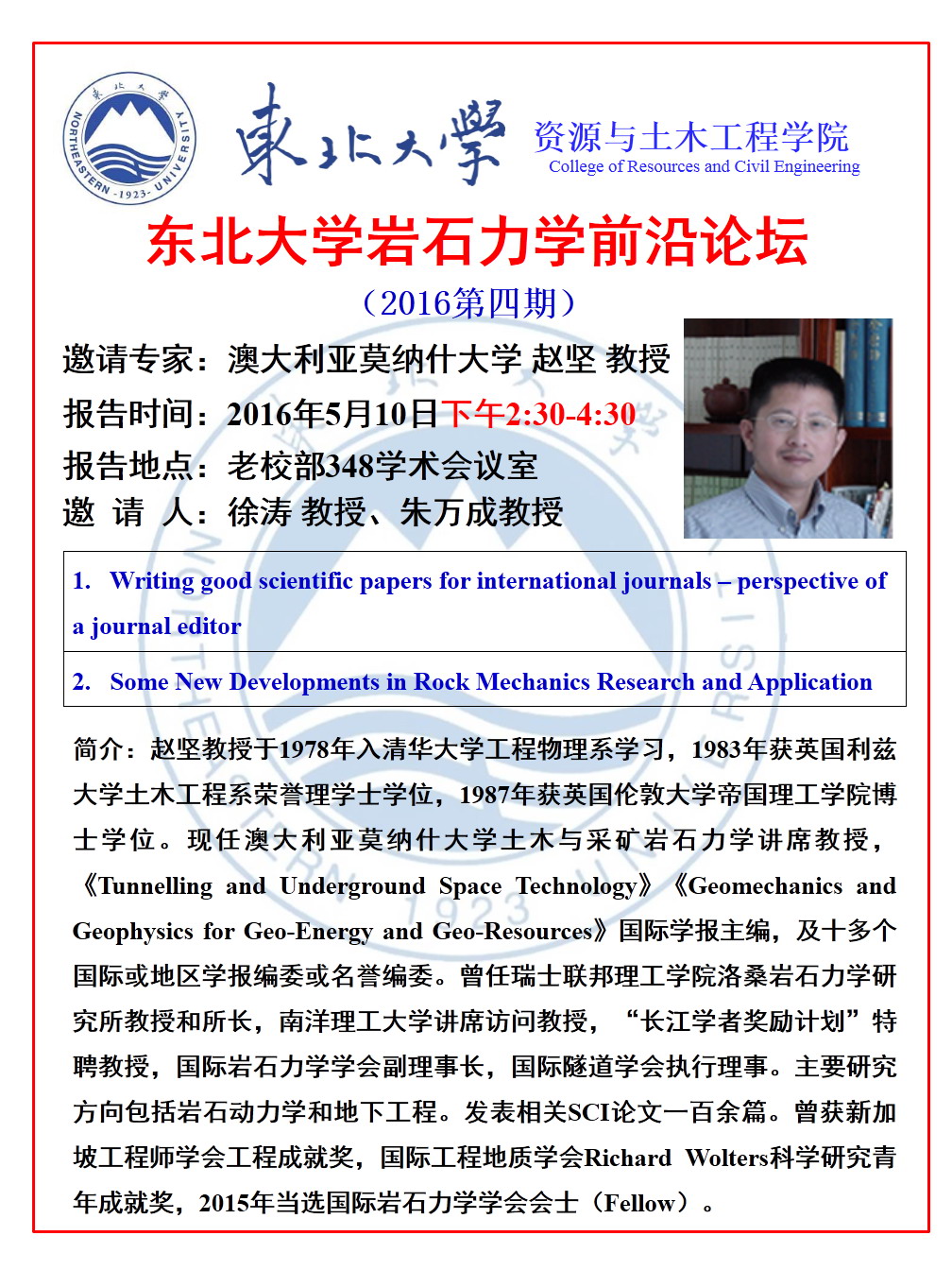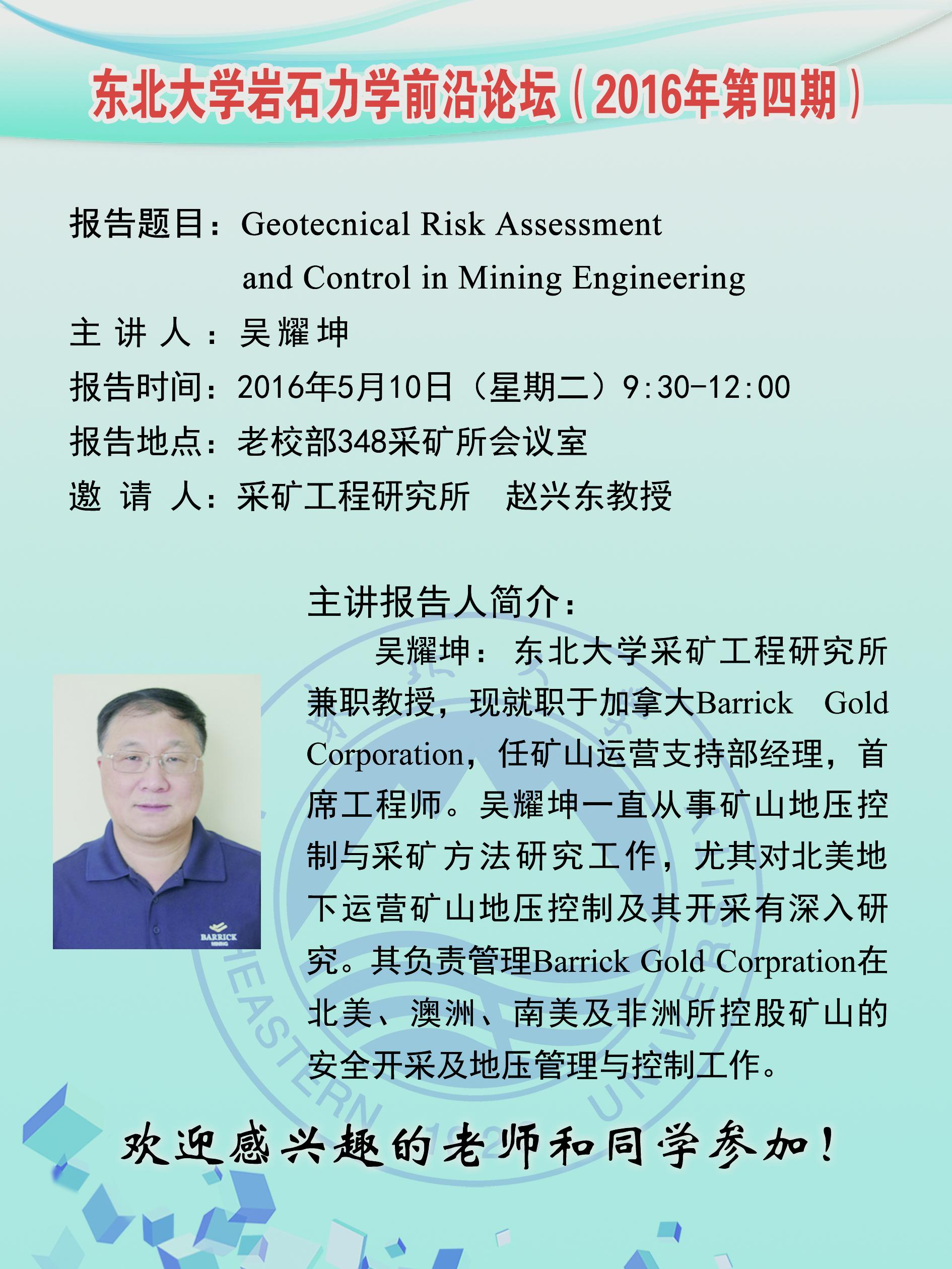 东北大学岩石力学前沿论坛(2016年第四期)预告
