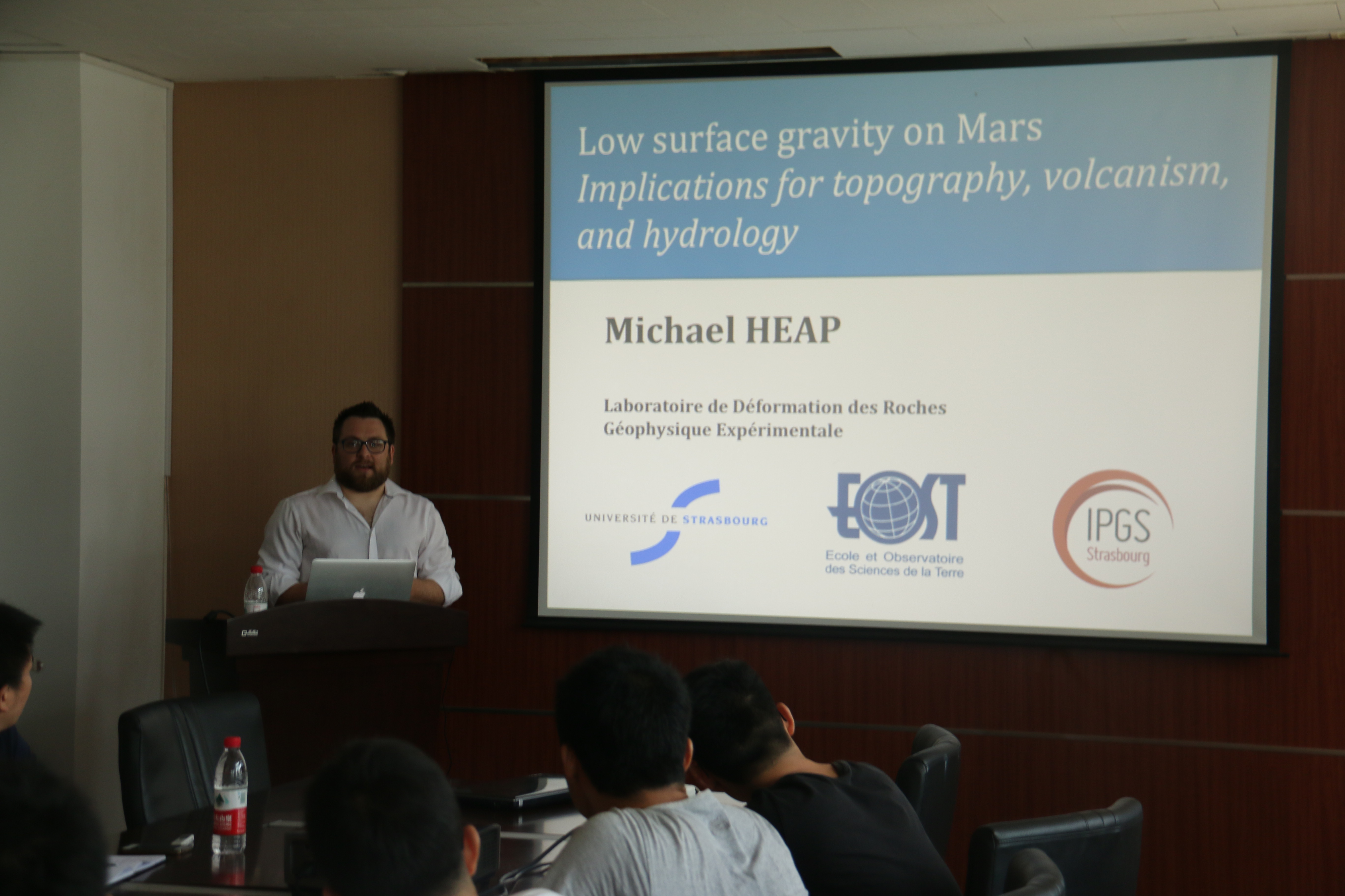 Michael HEAP博士在采矿系会议室作了题为“Low surface gravity on Mars-Implications for topography, volcanism, and hydrology”的学术报告。学术报告会上Heap博士与岩石破裂与失稳研究所的老师和研究生就火星上低的重力对火星地形、火山活动和水文地质产生的影响,并现场回答了各位老师和同学提出的问题。