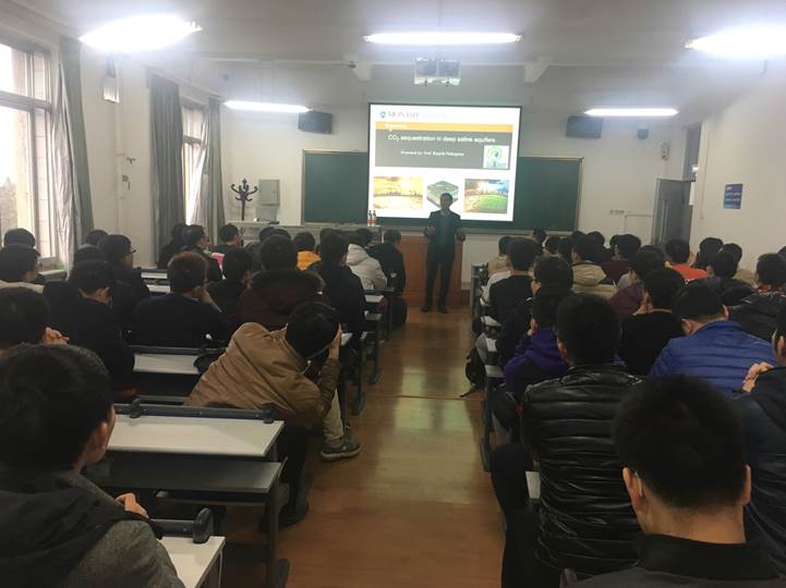 Ranjith教授分析了社会发展依赖的以煤炭、石油为代表的常规能源和以太阳能为代表的新型能源消耗比重的变化趋势,阐述了常规能源消耗过程中所产生的二氧化碳对气候、温度及生态环境的影响,并展示相关实例,之后介绍了现今国际上应对二氧化碳排放的一些条例和措施,随之提出自己对于此方面的看法——将二氧化碳封存于盐碱含水层中,以降低空气中二氧化碳的浓度并减少其带来的负面影响。其中,他就二氧化碳收集、封存、贮藏地点以及其对周围环境的影响和学生进行了谈论。最后,Ranjith教授还介绍了莫纳什大学的相关情况并欢迎我校同学前赴留学深造,得到了同学们的热烈反响。