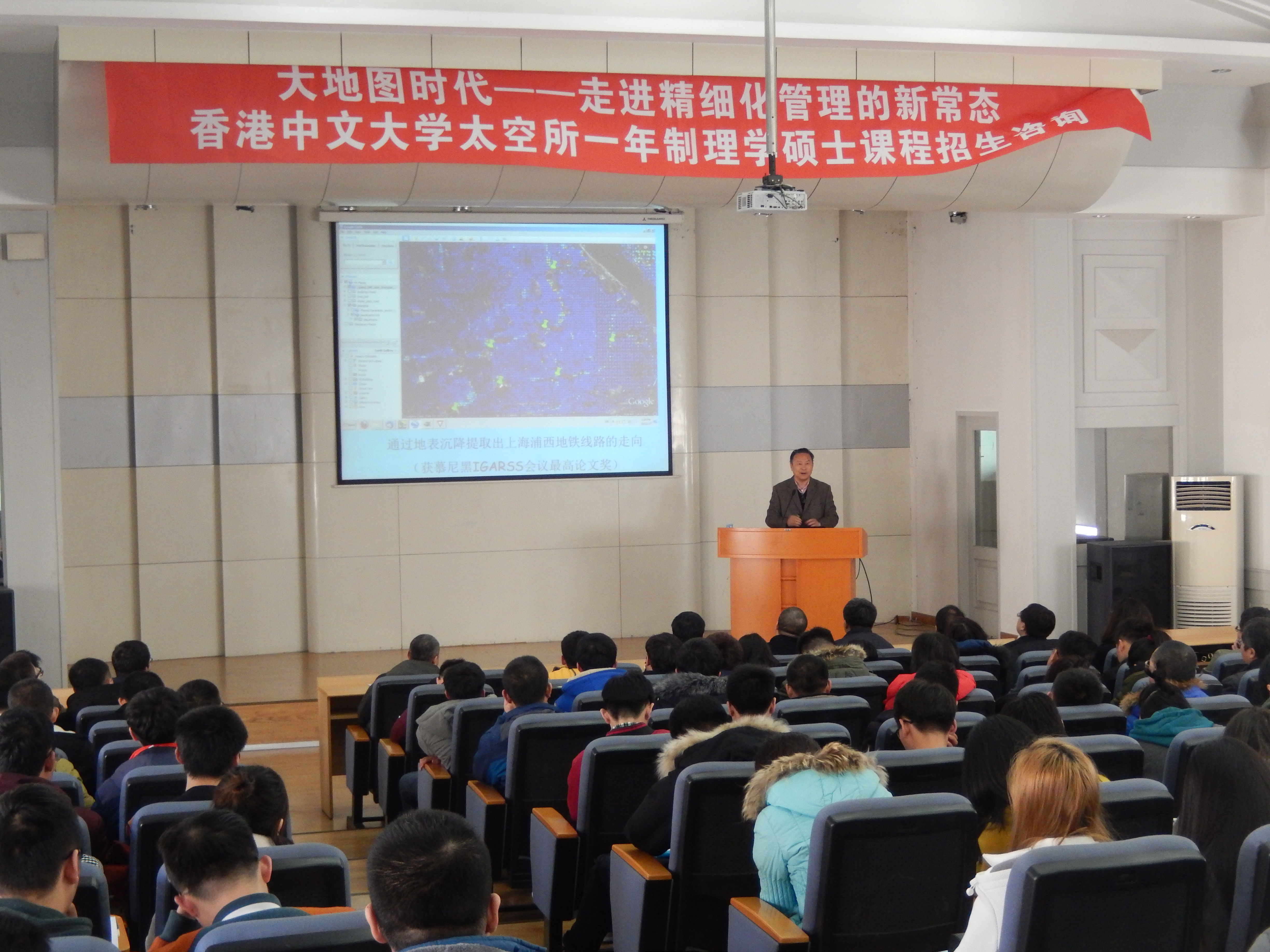 林珲教授通过自己40年来从事测绘地理信息事业的经历,评述了当前测绘地理信息领域的发展热点以及未来国家在这个领域的战略布局,提出了在大数据时代,地图的发展和管理要精细化,通过与互联网技术的结合,形成地理信息数据库,从而对数据进行及时更新和应用分析。林教授的报告深入浅出,密切联系生活实际及当前社会现状,通过大量生动的案例,列举了地理信息科学与技术在众多领域的应用。报告结束后,林教授还就香港中文大学太空所理学硕士的招生、培养等事宜,进行了答疑和咨询活动。