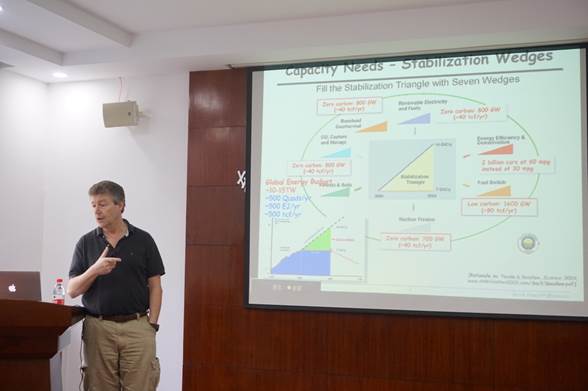 在6月21日上午学术报告中,Derek Elsworth教授做了题为“Key Challenges for Waterless Recovery of Energy and Fuel”的报告,首先介绍了中国、美国的能源需求、全球范围内的CO2排放形式以及传统化石能源开采遇到的难题,强调了天然气特别是非常规天然气开采的重要性,并且介绍了非常规天然气开采过程中所要达到的目标,包括提高产气率、降低水的使用量、降低对储层的污染等,然后重点介绍了研究团队在这一方面取得的成果:(1)选取不同压裂液的实验结果;(2)二次压裂时机的判断;(3)裂隙所引起的裂隙、断层滑移;和(4)储层在化学、压力、热等外界条件作用下的稳定性。