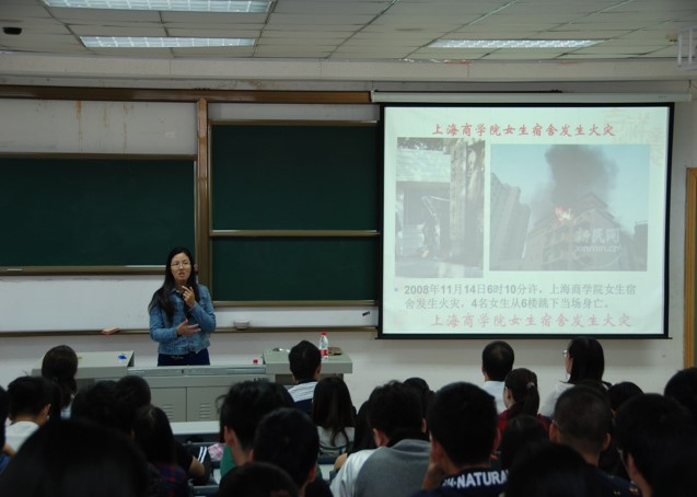 张培红以上海商学院宿舍火灾事故为切入点,形象还原了事故发生现场,全面剖析了违规使用电器、缺乏安全常识及应急处理知识所可能带来的危险。同时,通过介绍我校近年来在宿舍、实验室发生的火险以及播放事故现场视频等方式,揭示事故发生给人民生命、国家财产带来的巨大损害,提醒一定要正确操作电器及进行实验,并向与会同学阐述了火灾的预防、处理及逃生须知,对废弃化学品的处理、踩踏及烟气泄露等其他类型事故与伤害的预防和控制进行了培训教育,详细介绍了常见消防器材的使用方式及相关消防法律法规。她强调学生在校学习、生活一定要加强安全防范意识,寝室及实验室要做到“整理、整顿、清扫、清洁”的安全基本要求,切实提高安全意识,创造安全的学习生活环境。