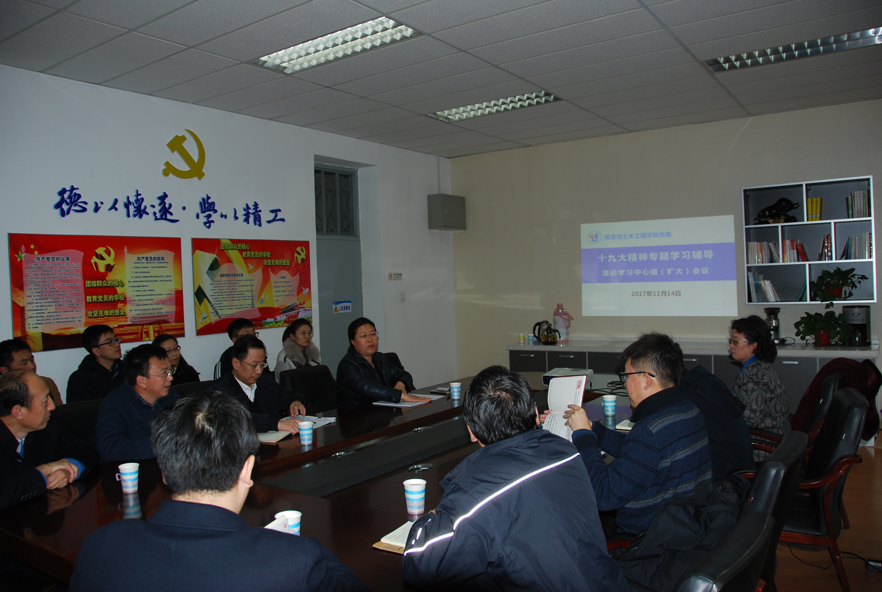 11月14日,学院党委理论中心组(扩大)学习在采矿学馆223室举行,学院领导班子成员、党委委员及全体机关干部参加会议。邱秀华教授应邀作了题为“新思想引领新时代——学习十九大关于‘习近平新时代中国特色社会主义思想’的体会”的专题辅导报告。学院党委书记王立慧主持会议。