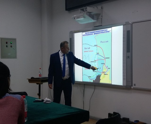 Kudryavtsev Sergey教授作了题为“‘一带一路’哈尔滨—牡丹江—海参崴高速铁路建设设计”的学术报告,讲座由赵文教授主持并担任翻译,报告中Kudryavtsev Sergey教授具体介绍了俄罗斯地质情况以及哈尔滨—牡丹江—海参崴高速铁路建设设计规划,并对在建设设计哈尔滨—牡丹江—海参崴高速铁路过程中出现的岩土问题进行了详细介绍,包括如何解决在季节性冻土、在永冻土中修建管道、桥梁等复杂工程问题,为大家提供了研究冻土的新思路。最后Kudryavtsev Sergey教授重点介绍了一款俄罗斯国内通用的岩土分析软件,该软件可以实现地下土体和上部结构的精细化建模,可进行施工工况、冻土冻融等复杂工况的计算,具有精度高,操作简便的特点。