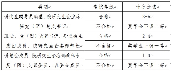 (2)研究生干部计分的等级划定和打分,由研究生会或班级讨论决定,并由主管研究生会的老师和辅导员商议确定,并有任职证明,研总会负责人(部门)签字盖章方可进行加分,研究生干部自行打分无效。