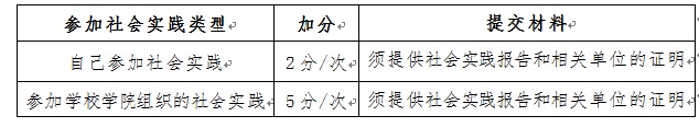 该项社会实践是指非实验室组织安排的、非专业领域范围内的有益于社会或他人的社会调查等公益性社会实践活动。社会实践加分最高不能超过5分,若实践活动获得奖励,可按奖励细则加分,但不可重复加分。