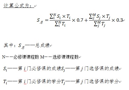 研究生学习成绩计分课程为研究生培养计划规定的学位课程,总分为必修课成绩加权平均分乘0.7与选修课成绩加权平均分乘0.3之和,学位课成绩为教学部门认可的有效成绩,并由研究生院或院教学办提供并核准。