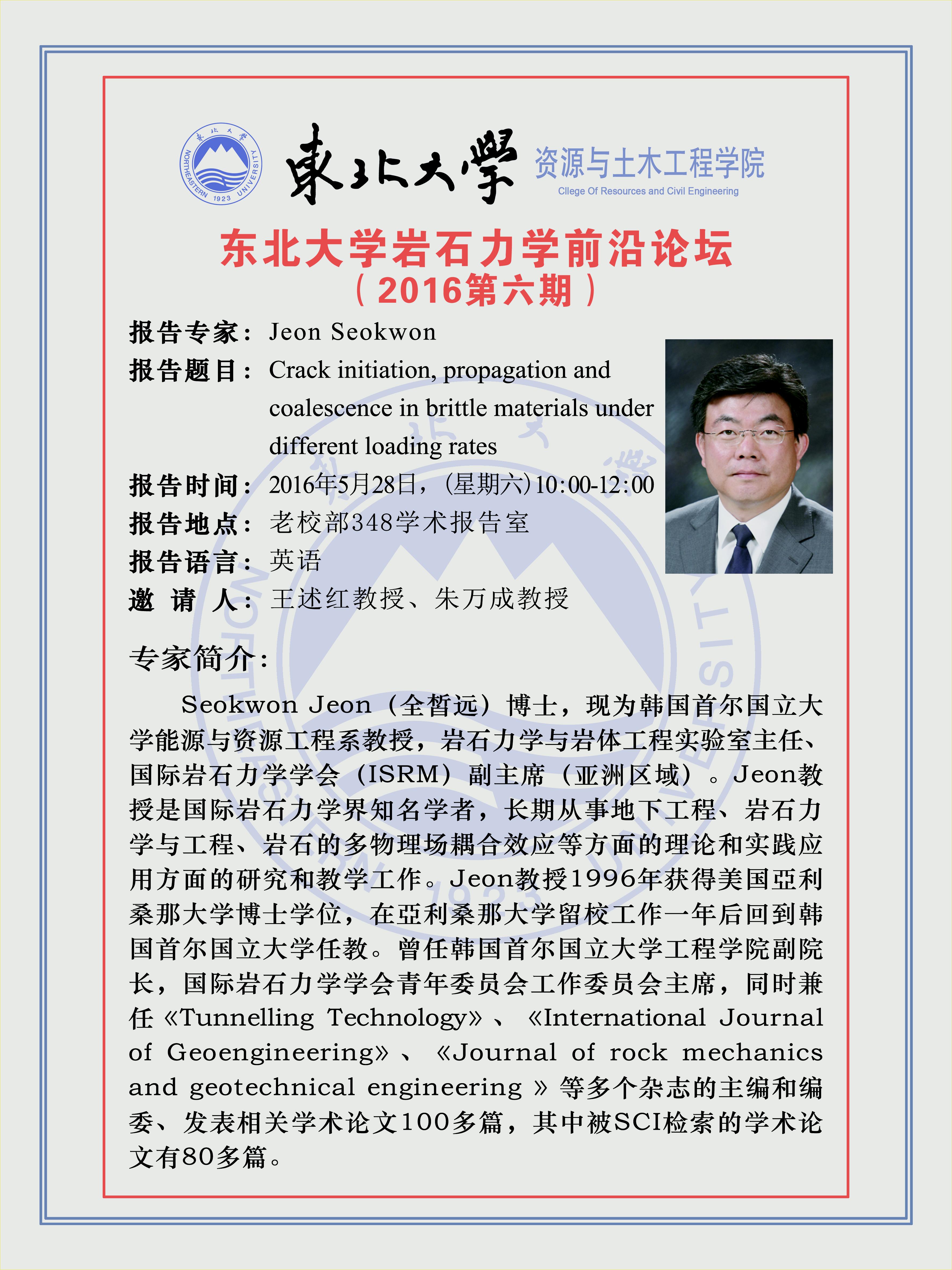 东北大学岩石力学前沿论坛(2016年第六期)预告