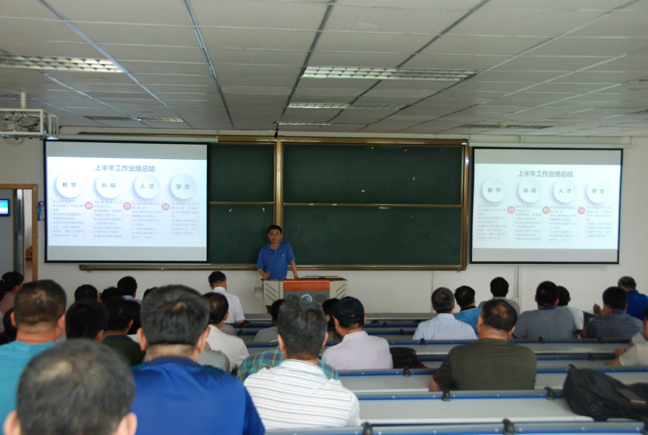 院长韩跃新总结了上半年学院在教育教学、科学研究、队伍建设、人才培养等方面取得的工作成绩,部署了学院下一阶段的工作重点。他强调学院工作必须以学科评估整体要求为着眼点,以“引育大人物、承担大项目、建设大平台、产出大成果、发表高水平论文”为发展目标,以本科教学为核心,不断强化研究生培养的过程管理,高度重视基础研究和成果转化,引育并重、推进团队建设。同时,学院也将充分发挥领导班子的协调与引领作用,不断拓展国际交流与合作的深度和广度,调动基层学术组织的能动性,做好准备,迎接第五轮学科评估。最后,他希望全体教职工找准定位、发挥强项、团结一心、精诚合作,为学院发展建设贡献力量。