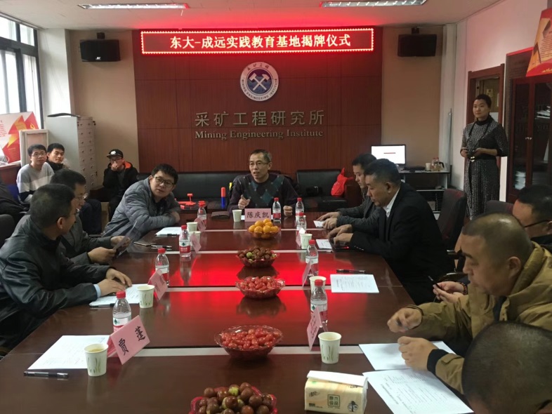 成远矿业开发股份有限公司罗乃鑫董事长一行六人与东北大学教务处刘维副处长、资源与土木工程学院贾蓬副院长、采矿工程系朱万成主任、刘洪磊副主任、陈庆凯副教授,深采教育部重点实验室张凤鹏教授、徐帅副主任及多名教师参加了授牌仪式。