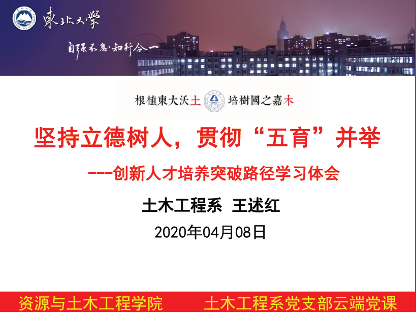 4月8日下午,土木工程系党支部通过腾讯会议的方式共上“云端党课”。土木工程系王述红教授以“坚持立德树人,贯彻‘五育’并举”为题讲授专题党课。