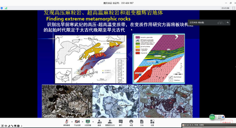 线上讲座中,钱加慧首先介绍了变质学基础知识,包括变质反应、典型结构构造、PTt轨迹获取方法及对构造背景的指示意义等;随后结合科研热点和实际应用实例,论述了变质作用与变质岩研究在科学研究和具体应用中的重要地位。讲座结束后,学生反响热烈,积极与钱老师沟通变质岩及相关矿物研究相关问题,如“主晶定向及出溶晶体定向研究”和“碰撞带仅发现浅变质岩的原因是什么”等。