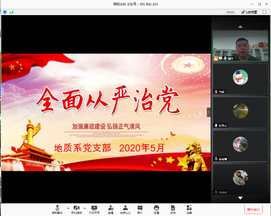 5月28日下午,地质系党支部在线召开全面从严治党工作会议,全面传达和落实学校2020年全面从严治党工作视频会议精神,对从严治党和党风廉政建设工作作出部署,党支部书记程浩主持会议,地质系全体师生党员出席会议。