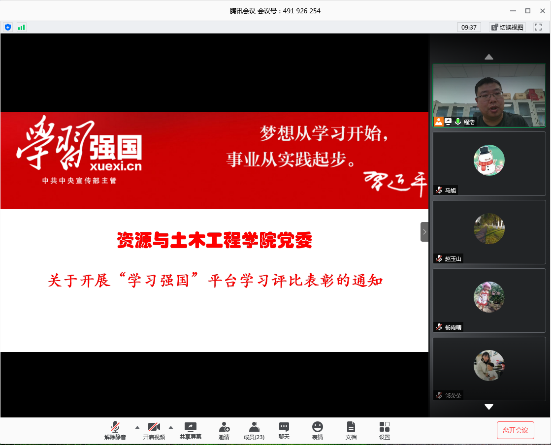 同时,会议还对学院下发的《资源与土木工程学院关于开展“学习强国”学习平台“先进个人”“先进集体”评选表彰的通知 》进行了解读。党支部书记程浩对全们党员师生们前期在“学习强国”上的学习情况做了总结,邀请几位“学习强国”中的积极分子谈了学习的心得体会,对即将到来的学习强国评比进行了动员.
