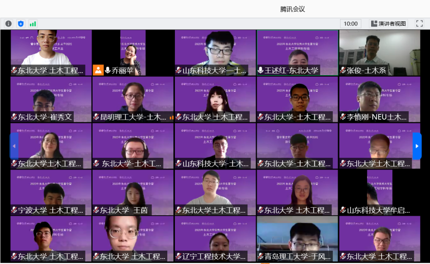 2020年7月14日,东北大学资源与土木工程学院举行了东北大学2020年优秀大学生“云端”学术夏令营(土木工程学科专场),来自东北大学、江南大学、南昌大学、昆明理工大学、太原理工大学、内蒙古大学、青岛理工大学、东北农业大学、西南石油大学、安徽理工大学、沈阳建筑大学、辽宁工程技术大学、宁波大学等高校的近50名优秀大学生及东北大学土木学科部分教师参加了此次“云端”夏令营暨土木工程学科研究生招生宣讲,会议由土木工程系副主任乔丽苹主持。