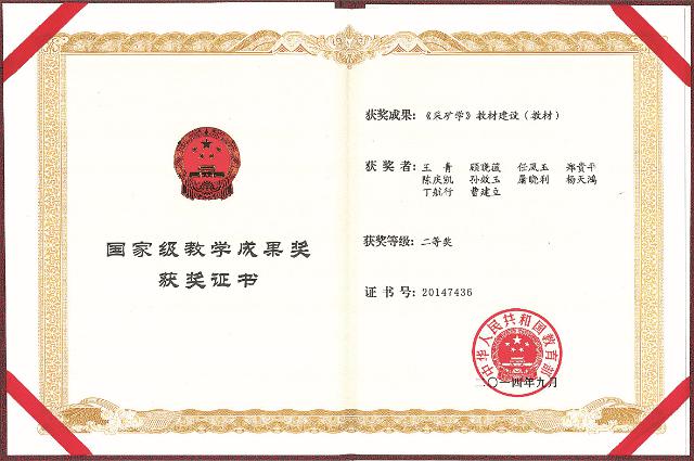 《采矿学》国家级教学成果二等奖证书