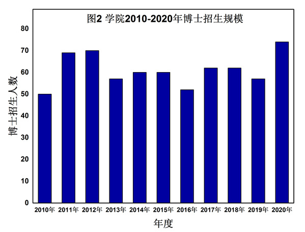 博士研究生招生规模有了较大增长。1993年,采矿工程系和矿物工程系的博士研究生招生总人数为20人,到2012年博士研究生招生总人数达到70人;“十三五”期间,学院博士研究生招生规模稳中有升,每年招生约60~70人,2020年博士招生人数达75人。