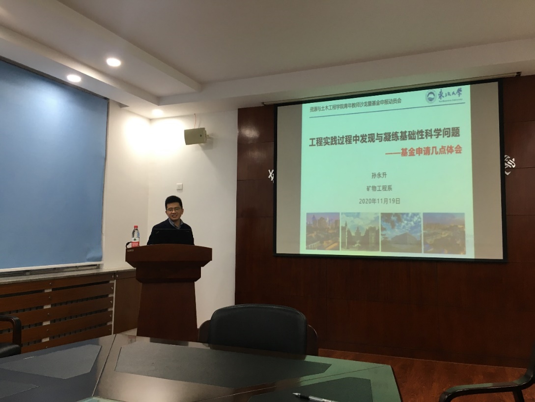 11月19日,学院在采矿学馆227室举办青年教师沙龙暨基金申报动员会,国家优秀青年基金获得者、矿物工程系主任孙永升应邀为青年教师作“如何从工程问题中凝练科学问题”的讲座报告。学院院长韩跃新、党委书记艾国生、副院长于庆磊出席会议,近40名青年教师参加。学院工会主席邱景平主持会议。
