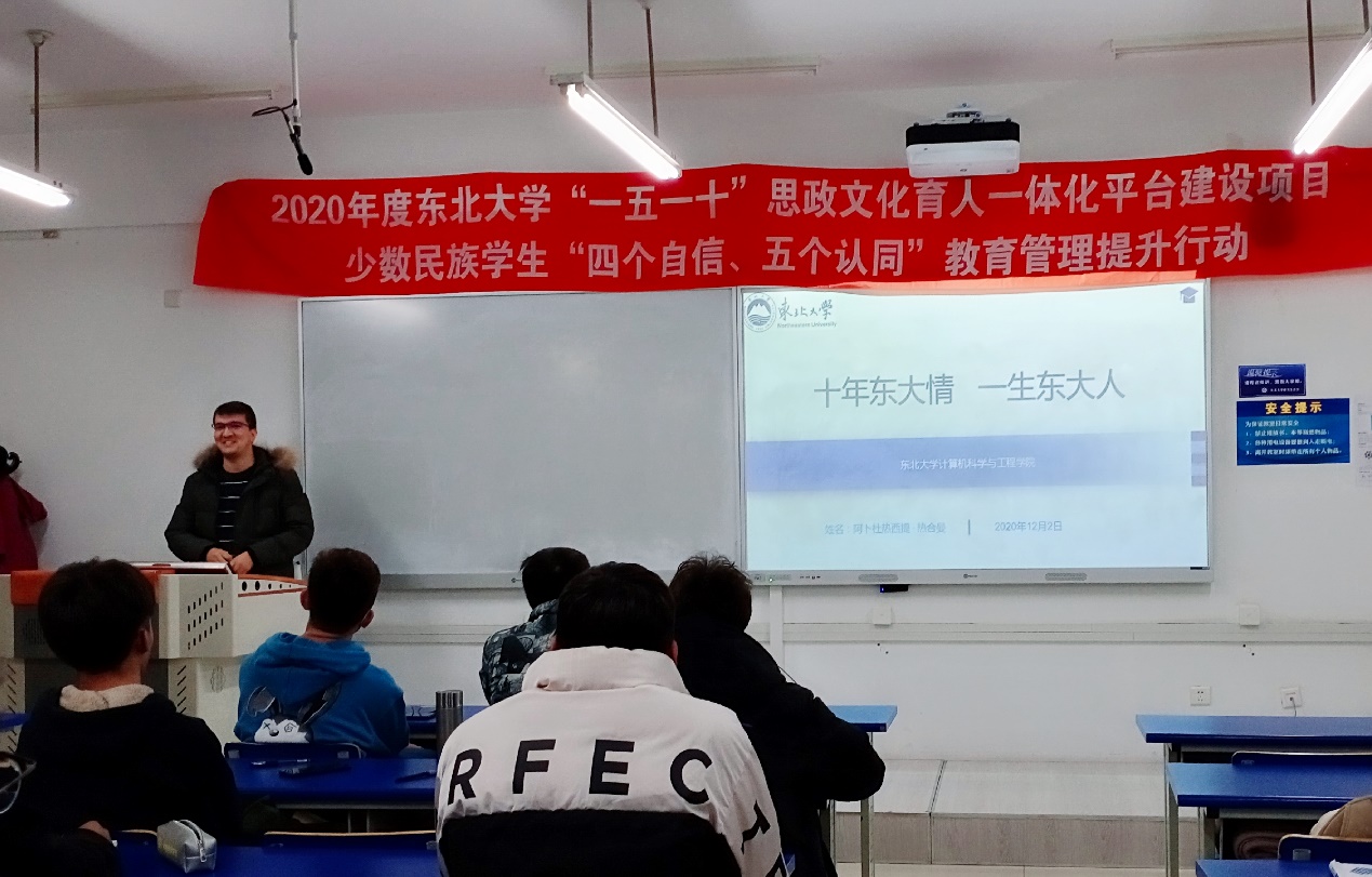 资源与土木工程学院结构工程17级博士研究生阿力普江、计算机科学工程学院19级博士研究生阿卜杜热西提,分别以《梦想与青春同行》、《十年东大情,一生东大人》为题,围绕在内地求学经历与感悟、国外留学经历与感想、本科生涯规划、行为习惯养成及课程学习方法等几个方面做了精彩报告。