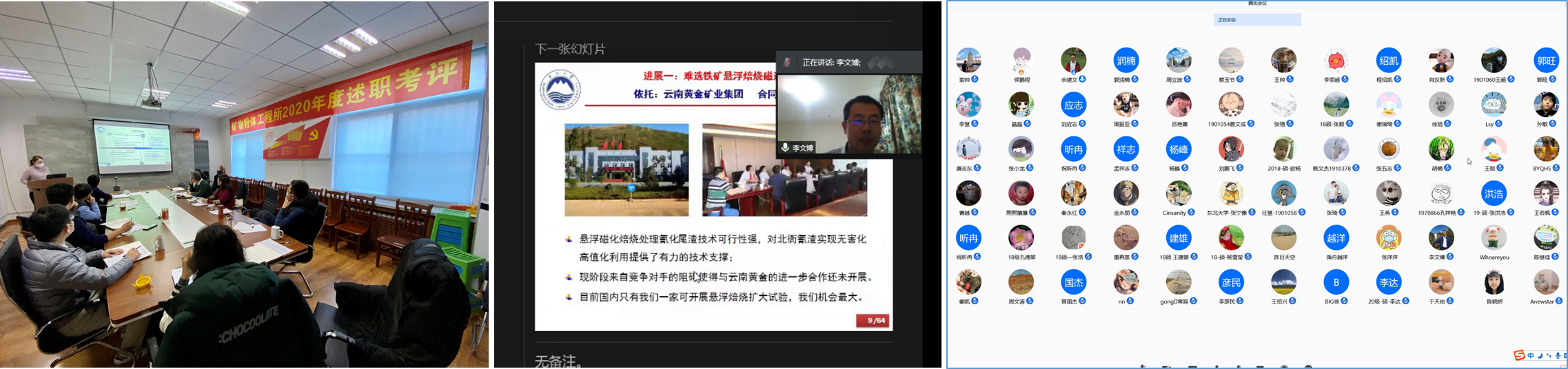 1月3日,矿物加工与粉体技术研究所举行2020年度述职考评会,研究所教职工、博士后及博硕士研究生参加了考评会。教职工线下分别汇报了年度科研工作进展及目标完成情况、人才培养情况及对学科建设和发展的贡献情况。博士后及研究生线上分别围绕年度参加的科研任务、课题进展、存在的问题与对策,以及下一步的工作计划等方面进行汇报。并通过综合评判,推选出研究所年度优秀研究生。