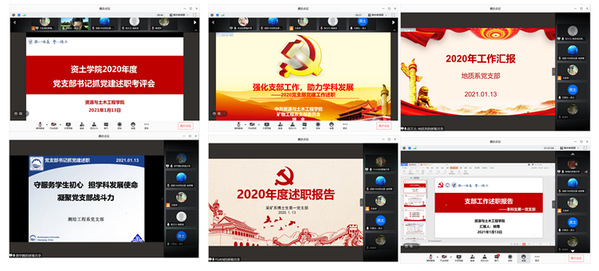 本年度党支部书记抓党建述职评议工作通过“线上+书面”的方式进行。其中,矿物工程系党支部、地质系党支部、测绘工程系党支部、采矿工程系博士生第一党支部、本科生第一党支部分别就学习贯彻习近平新时代中国特色社会主义思想以及落实党中央、教育部和学校决策部署情况,党支部规范化建设情况,加强思想政治工作情况,落实全面从严治党和廉政建设情况,支部特色工作以及工作成效与不足等方面进行了线上述职。学院党委委员分别进行了点评。其他教职工、博士生党支部进行书面述职,学生党支部由学生党总支结合实际安排述职工作。
