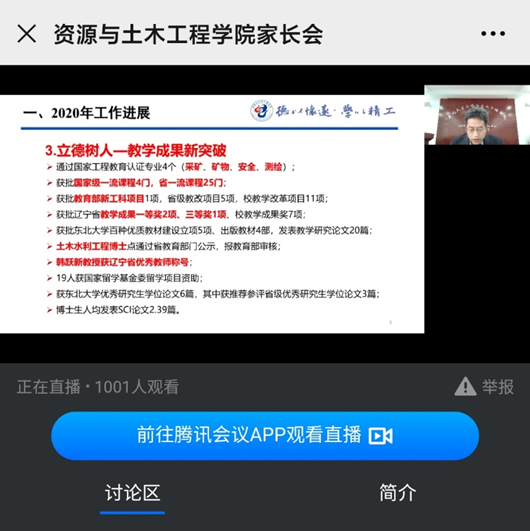 1月19日下午,学院通过腾讯会议直播的形式召开全体本科生云端家长会。东北大学纪委副书记、纪委办[监察室]主任王立慧、学院党委书记艾国生、学院副院长贾蓬应邀参会,学院党委副书记兼副院长刘婉婷主持本次会议。