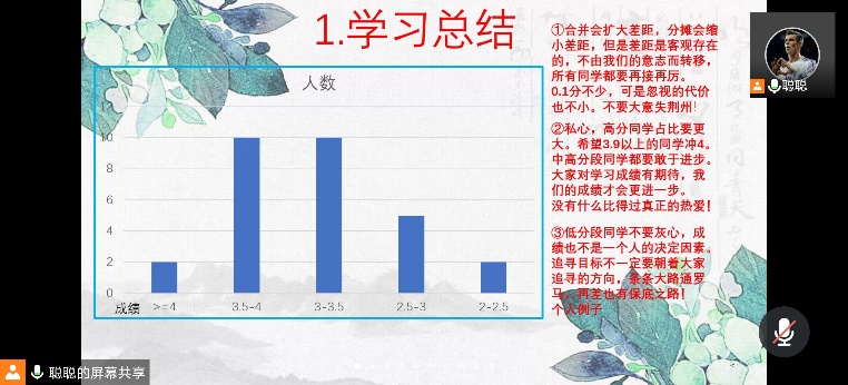 班会上,班导师传授了学习科研心得和方式方法,为同学们提供了科学研究、学术发展规划等方面指导。各班根据实际情况,分享了上学期班级建设取得的成果,重点分析期末考试成绩以及学习方面存在的不足,针对性地提出寒假的学习建议,并邀请班内学生代表和优秀学长传授学习经验。此外,班会上普及了疫情防控知识和要求,倡导同学们提高疫情防控意识,保持良好的作息时间和生活习惯,部分同学还分享了居家防疫措施和寒假生活规划。