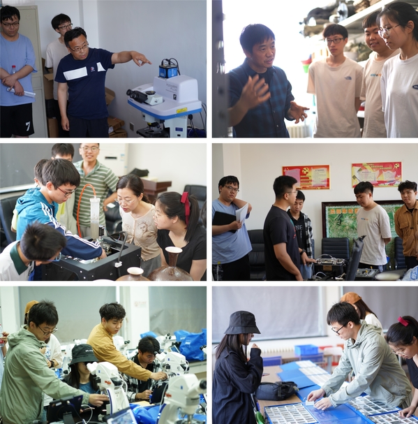 在专业介绍和科普报告之后,在姚玉增老师、付建飞老师和多位研究生的讲解中,同学们参观了激光拉曼光谱仪、物探设备、化探设备、3D打印设备和矿物釉工艺品。高年级同学为大一同学介绍了矿物、岩石、矿石和古生物标本。同学们还在岩石学实验室体验了蔡司光学显微镜的使用,观察了岩石薄片和矿石光片。