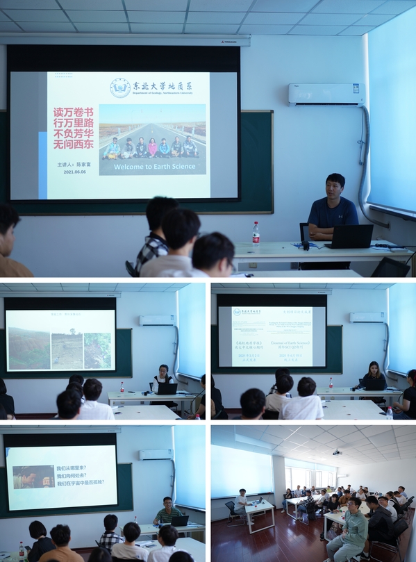 陈家富老师从大学应该如何度过,兴趣、专业和工作的关系,地球科学与社会发展,以及资源勘查工程专业的概况等方面进行了详细讲解。博士研究生杨雨晴和硕士研究生洪阳百合和大家分享了在古生物和大地构造方向的研究生学习和生活的体会和感想。2018级本科生刘伯雷和贾新龙分别分享了自己参加大学生创新训练计划的心得,以及在陨石研究和3D打印方面的成果。金锤社是地质系教师指导下的学生社团,社长张一凡同学着重介绍了社团与地球科学相关的科普、户外拓展等活动。