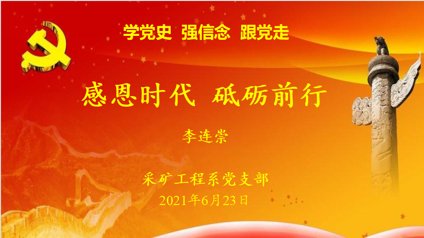 6月23日下午,采矿工程系党支部在采矿系会议室开展“学党史,强信念,跟党走”党史学习专题党课。采矿工程系党支部组织委员李连崇以“感恩时代,砥砺前行”为主题,结合自己在“本溪抗联史实陈列馆”“大梨树村培训教育基地”“丹东抗美援朝纪念馆”和“鸭绿江断桥”等现场学习中的收获和感悟进行了阐述。
