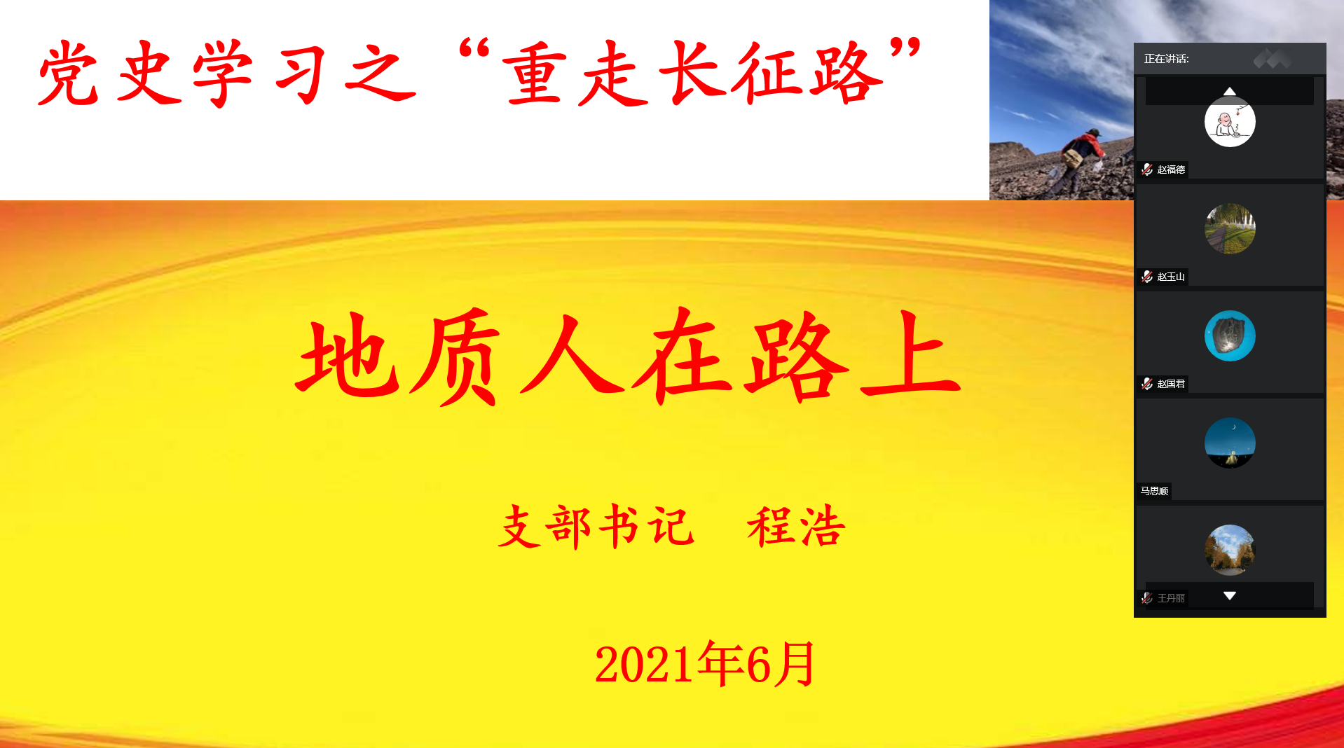 另讯,6月25日,地质系党支部开展党史学习教育专题党课活动,党支部书记程浩以“党史学习之“重走长征路”——地质人在路上”为题为师生讲党课。程浩从党史学习讲起,将“重走长征路”与地质系的历史与未来发展相联系,“铭记百年历史,传承红色基因”,同时结合地质系的工程认证事宜与各位党员同志进行探讨与交流。会议得到了地质系全体教师的积极响应,讨论热烈,取得了良好的效果。