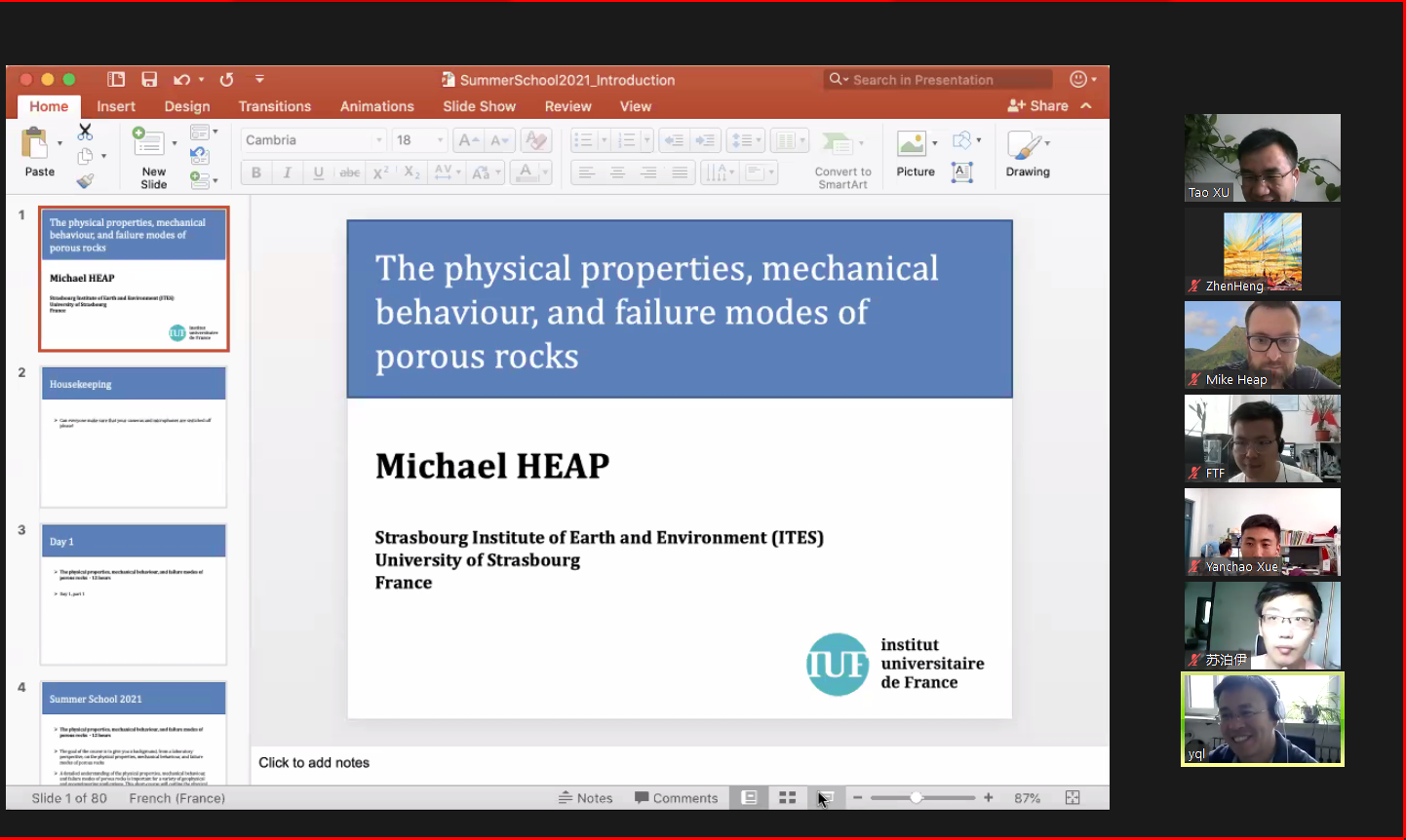 应学院徐涛教授邀请,法国斯特拉斯堡大学地球科学学院Michael Heap副教授于7月27-30日下午为采矿和土木等相关专业老师及研究生线上讲授了“The Physical and Mechanical Properties of Porous Rocks”课程。课程重点介绍了多孔岩石的物理特性、力学行为和破坏模式和这些特性和参数的测量方法,以及岩石微观结构、差应力、温度、水分、应变率等因素对岩石的物理力学性质的影响。让同学们充分了解了岩石脆性、延性、破坏包络线、剪切带、压密带、微观孔隙扩展模型、微观翼裂纹模型等基本概念,以及岩石的单轴和三轴变形破坏特征、强度理论等。
