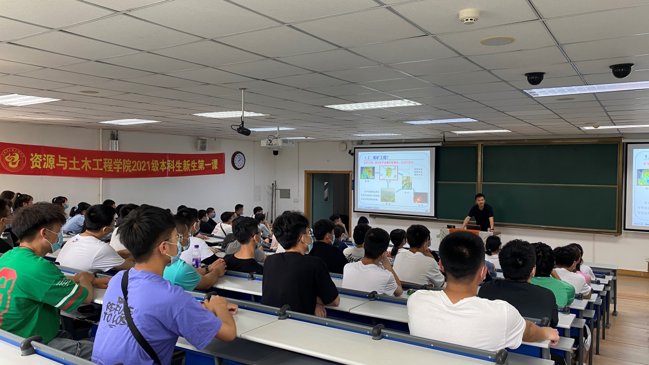 9月9日下午,2021级新生第一课在采矿学馆成功举办,由于疫情常态化防控的要求,新生分散在4个教室采用线上直播方式集中收看。