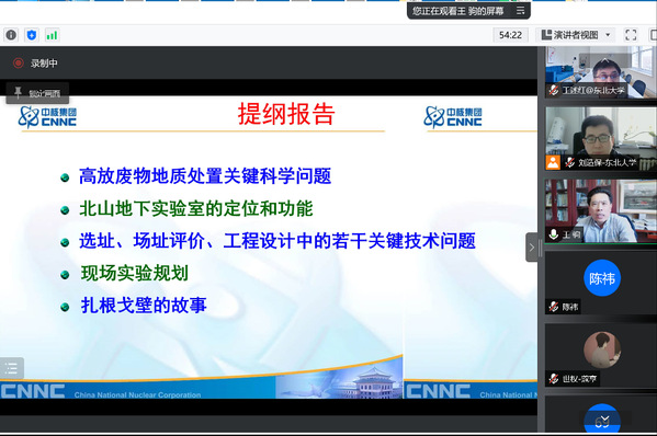 4月15日,核工业北京地质研究院副院长王驹研究员应邀做客“百年东大·红砖讲堂”,以“高放废物地质处置关键科学问题及北山地下实验室进展”为题作线上学术报告。报告重点介绍了高放废物地质处置关键科学问题,北山地下实验室的定位和功能,选址、场址评价、工程设计中的若干关键技术问题、现场试验规划以及团队扎根戈壁的故事,报告内容对接我校核心课程“科学精神与人文素养”。报告会之后,王驹研究员跟参会老师进行讨论,近300名师生参加报告会。