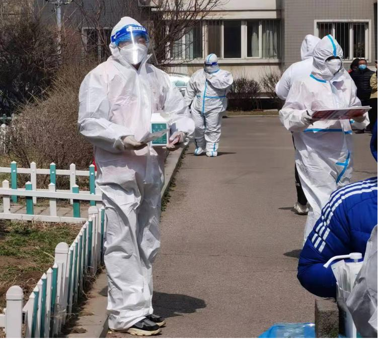 党员靳建平在协助社区完成抗疫核酸检测工作