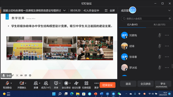 4月29日,教育部土木工程专业课程思政研究虚拟教研室通过线上方式举行一流课程及课程思政建设专题研讨会。虚拟教研室近50名成员参加会议,教研室负责人康玉梅主持会议。