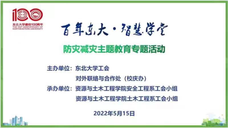 2022年5月12日是我国第14个“全国防灾减灾日”,为纪念汶川地震14周年,围绕今年全国防灾减灾日主题“减轻灾害风险,守护美好家园”,进一步普及防灾减灾知识,提高广大师生防范意识和避灾自救技能,由校工会、对外联络与合作处(校庆办)主办,资源与土木工程学院安全工程系和土木工程系工会小组承办的“百年东大·智慧学堂”防灾减灾主题教育专题活动于5月15日下午在线上举行。对外联络与合作处处长李鹤、校工会副主席张琦、安全管理委员会办公室裴悦路应邀出席本次活动,资土学院安全工程系、土木工程系师生、对外联络与合作处(校庆办)教职工参加活动。