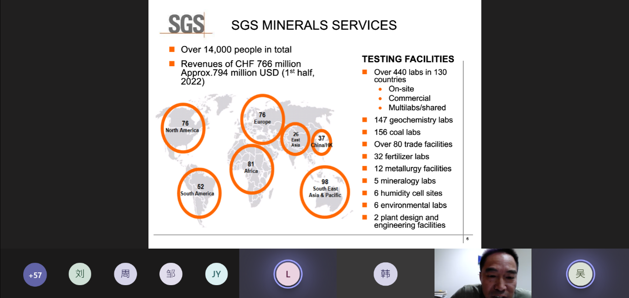 报告中,丁可鉴博士首先介绍了加拿大SGS公司的基本情况,分享了SGS公司在勘探、选矿、冶金等领域先进的检测分析技术手段,并重点介绍了SGS公司在铜、铅、锌、镍、金、银等多金属矿选冶领域的先进试验设备、工艺技术及研发平台,此外还展示了SGS公司在矿山绿化、成本评估、流程设计、生产调试等方面的能力。