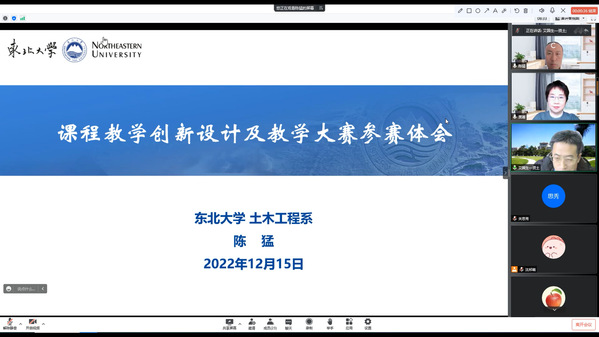 课堂教学是人才培养的基础单元,为了切实提升课堂教学质量,有效提升教学能力和教学水平,2022年12月15日下午,学院邀请辽宁省教师教学创新大赛特等奖获得者,土木工程系陈猛副教授作题为“课程教学创新设计及教学大赛参赛体会”的报告。本次会议采用线上会议的方式进行,学院党委书记艾国生、副院长贾蓬及各专业青年教师参加了此次报告,会议由贾蓬主持。