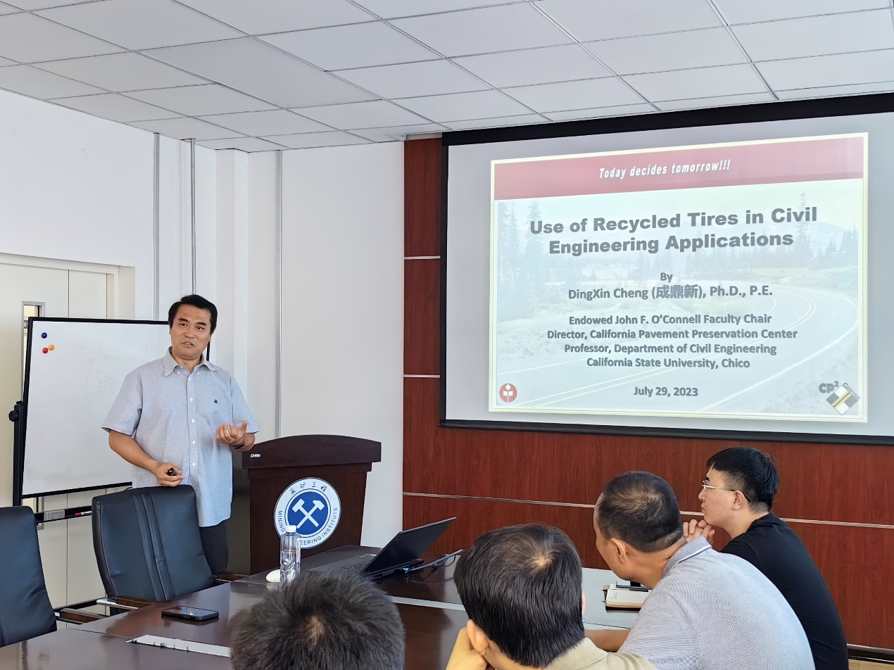 2023年7月29日上午,东北大学“百年校庆—国际名师大讲堂”在资源与土木工程学院老校部348会议室举行。美国加州州立大学成鼎新校友应冯夏庭校长和赵文教授邀请为土木工程系师生做“USE OF RECYCLED TIRES IN CIVIL ENGINEERING APPLICATIONS”主题报告。土木工程系部分老师和学生参加了本次讲座,会议由赵文教授主持。