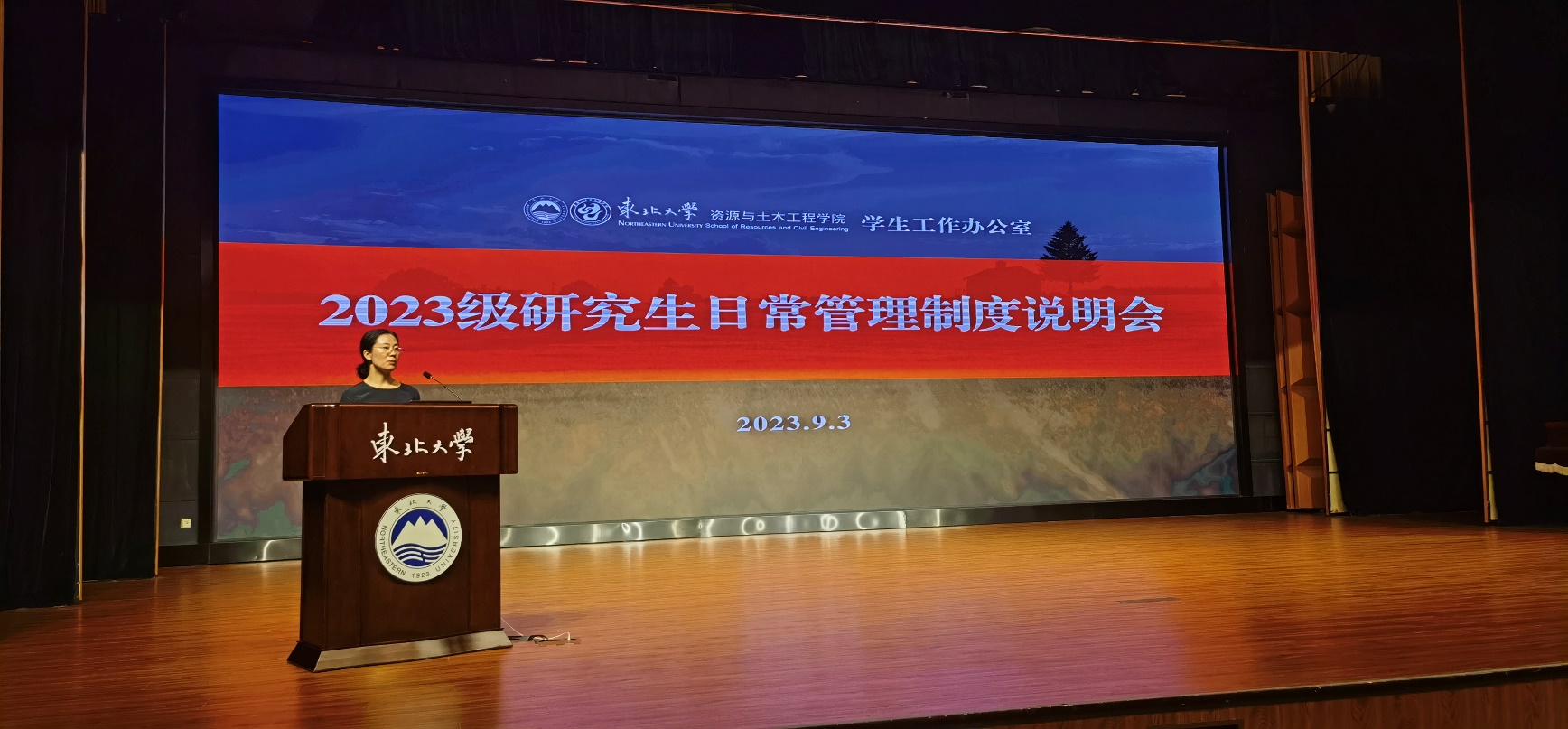 刘婉婷从研究生日常管理制度、思想政治教育、奖助学金体系等方面为同学们做了详细介绍,并着重强调了安全工作的重要性,对学校、学院制定的有关校园安全、实验室安全、网络安全等校规校纪作了细致解读。最后,她祝愿全体2023级研究生能够不负青春,学有所成,努力成长为新一代优秀的资土人。