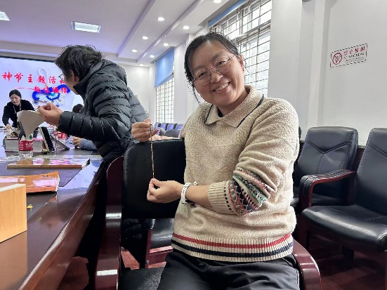此次活动学院特邀请了专业的编织老师,为大家详细地讲解了绳索色彩的选择以及绳结样式的寓意,女教工们在老师的指导下完成手链以及项链的编织。