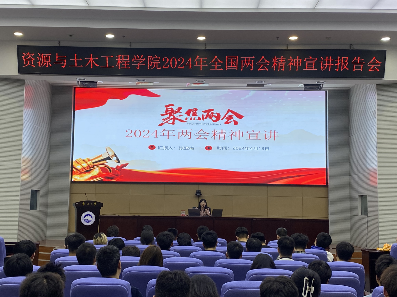 4月14日晚,资源与土木工程学院在综合楼822室召开党委理论学习中心组(扩大)学习,邀请东北大学校友、第十四届全国人大代表张亚梅为学院师生做全国两会精神宣讲报告。学院班子成员、党委委员、部分教师学生代表参加报告会。会议由党委书记艾国生主持。